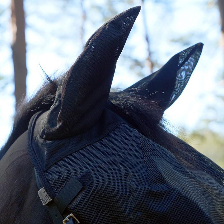 A unique fly mask for riding which protects your horse’s face, eyes and ears from flies and strong sunlight.