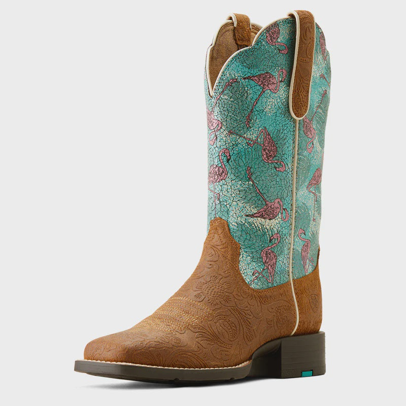 Ariat Ladies Round Up Wide Square Toe Embossed Chestnut Flamingos
