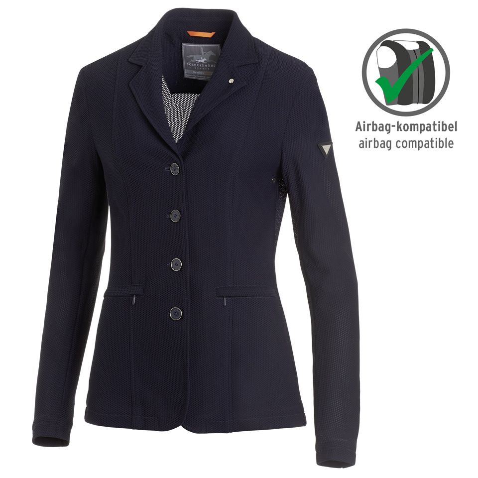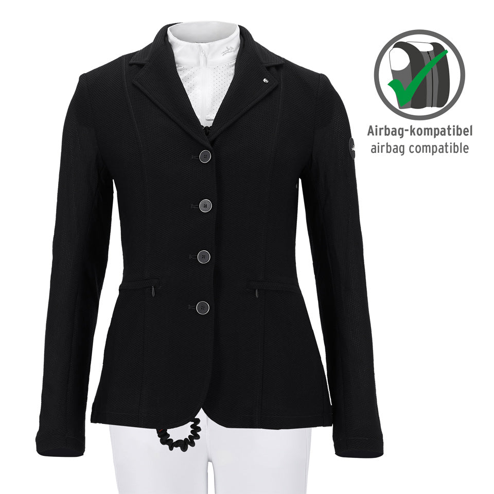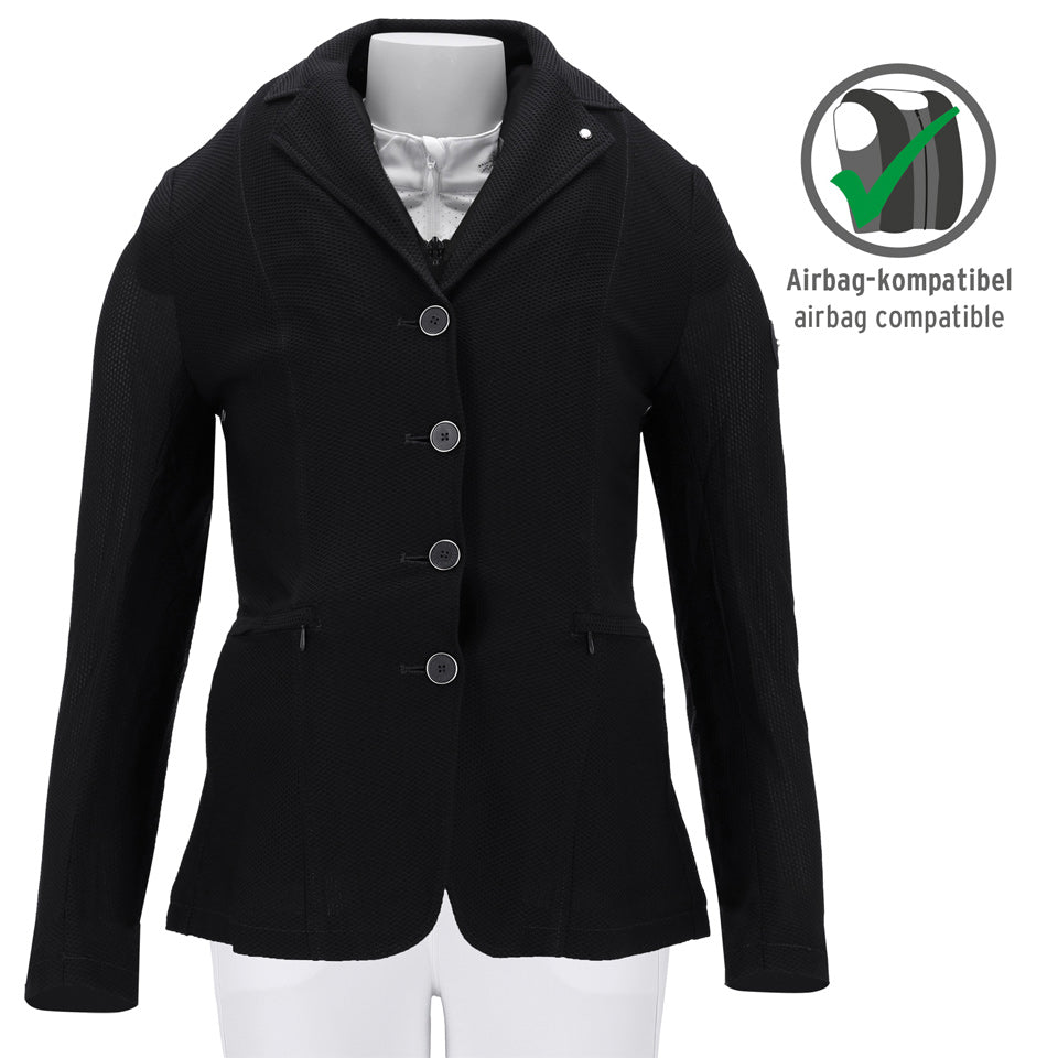 The Air Cool ladies show jacket by Schockemöhle Sports ensures a sporty and elegant appearance at your next horse show. With its fitted shape and decorative dividing seams at the front, this show jacket does not only look great, but is also very breathable thanks to the airy mesh fabric. Two splits provide freedom of movement in the saddle. Thanks to ventilation eyelets under the sleeves the jacket is also pleasant to wear even on warmer days.