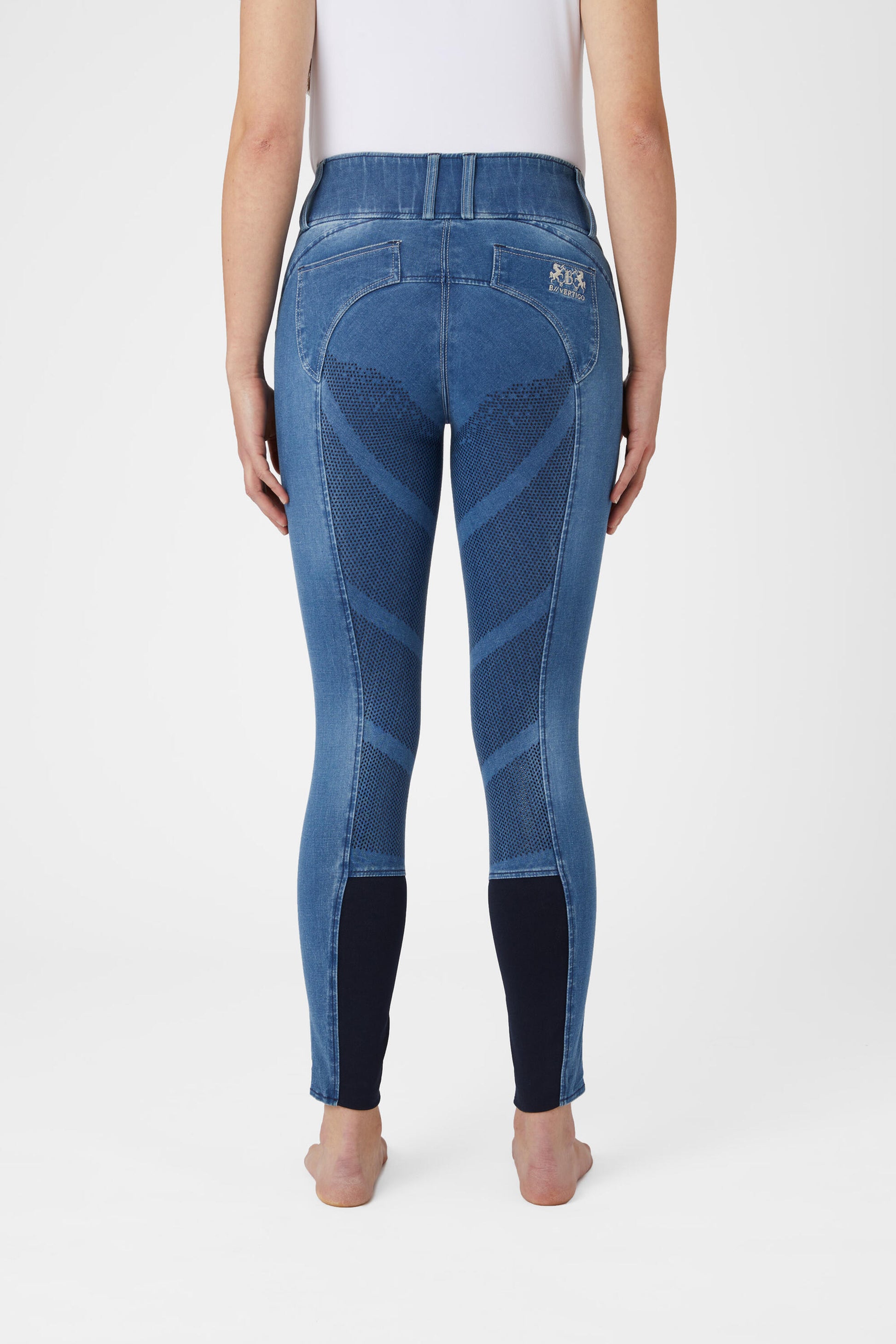 The B Vertigo Dianne breeches are made from soft, water and dirt repellent denim material. The high waist keeps them in place, and the silicone full seat keeps you in the saddle. Belt loops, 3 button closure and contrasting seams around pockets and belt loops add to the typical jeans look. Breathable fabric keeps you cool while riding or in the stables. Subtle B Vertigo embroidery adds a chic detail.