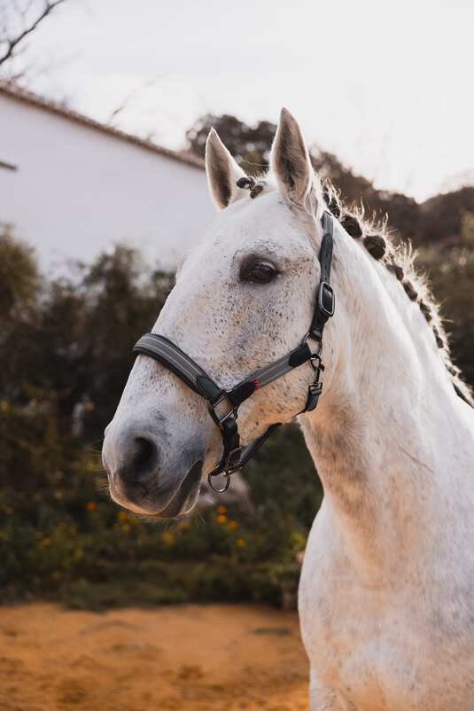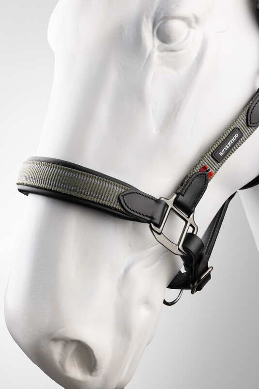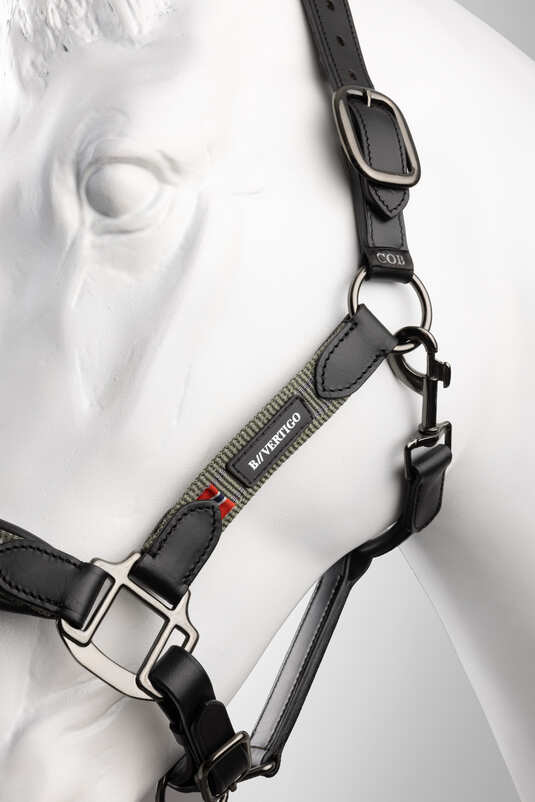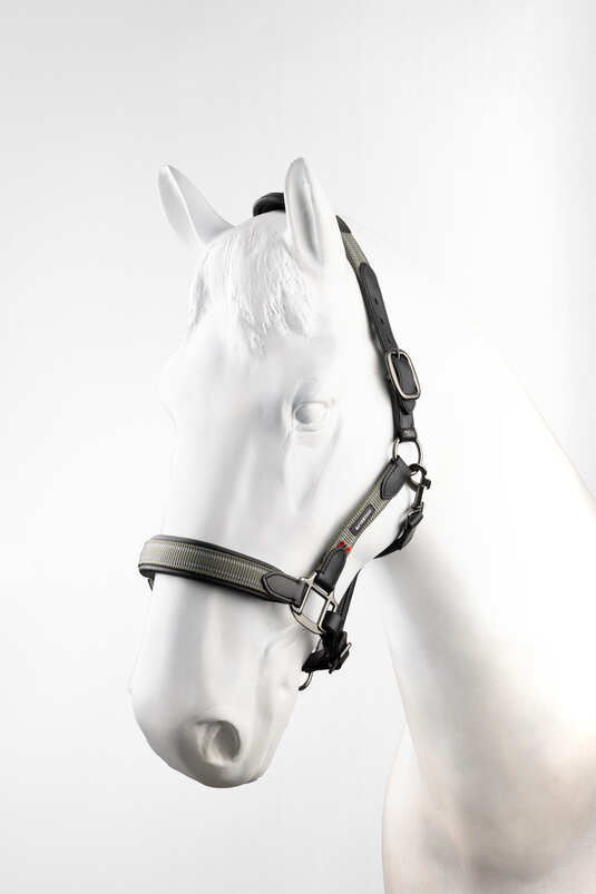 This high-quality leather halter combines durability and elegance. The webbed strap with a Lurex stripe on the cheek, nose, and crown adds a stylish touch. The anatomically shaped poll pad ensures a comfortable fit.