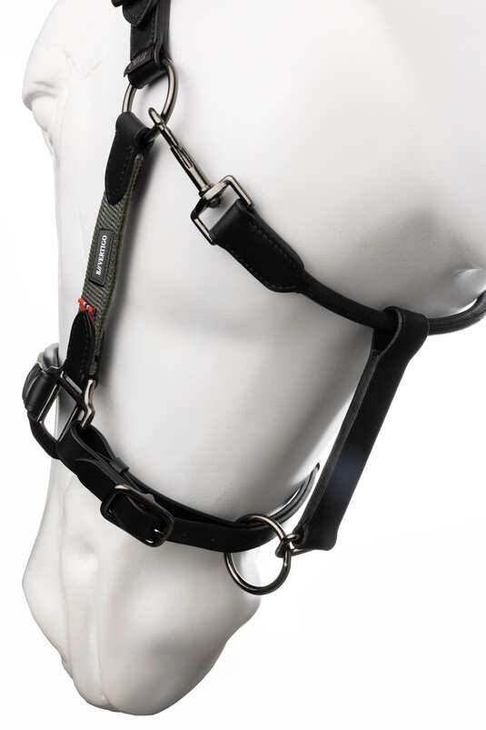 Made from genuine leather, with soft padded leather on the nose and crown for extra comfort. Gunmetal-colored metal fittings add a sophisticated look. Featuring a practical snap hook on the left cheek for easy handling.