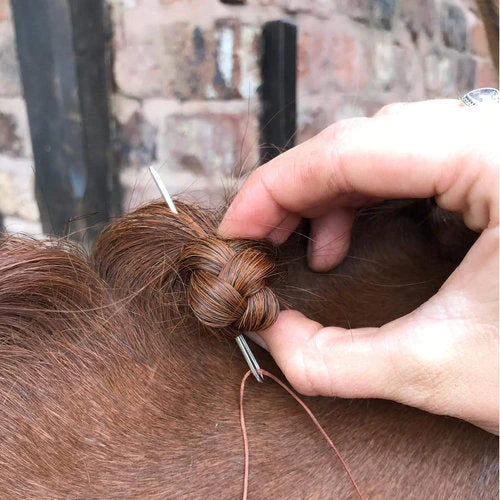 Set of nine blunt ended, large eye, plaiting needles in 3 sizes (52mm, 60mm, 70mm) to suit all manes. Supplied with a neat little clear plastic tube container.