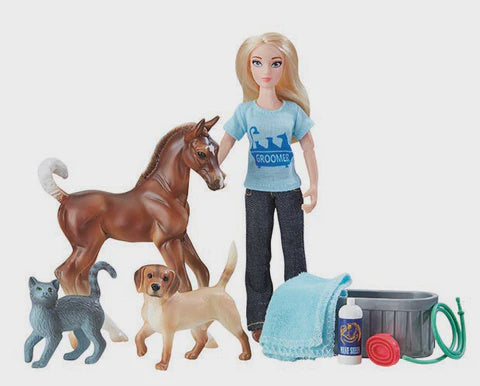 This engaging set includes everything needed to help the groomer get the animals clean and looking great. Includes: 6" articulated doll, pony, cat, dog, water trough, towel, shampoo bottle, and curry comb.