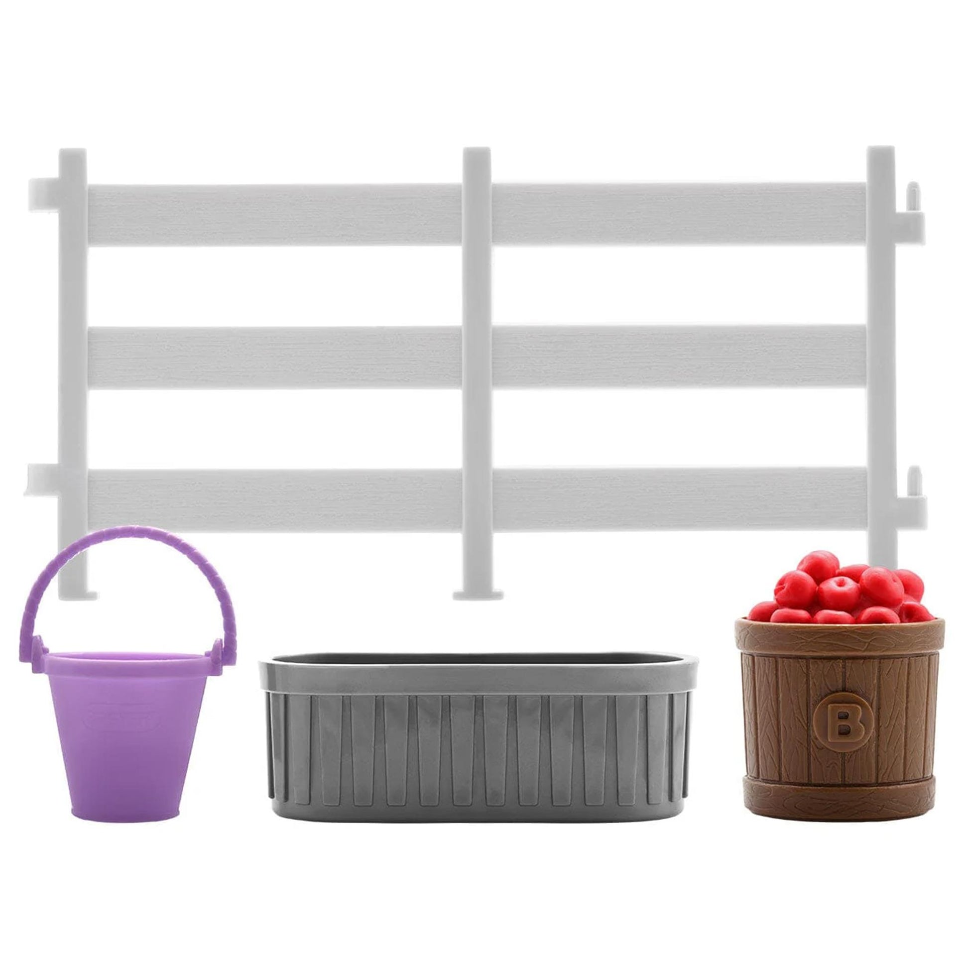 This playful pony family features a flaxen chestnut stallion, a grey mare, and their chestnut foal. It is a complete playset and includes six pieces of fencing, a water trough, feed pail, and a barrel full of apples. Get ready to play!