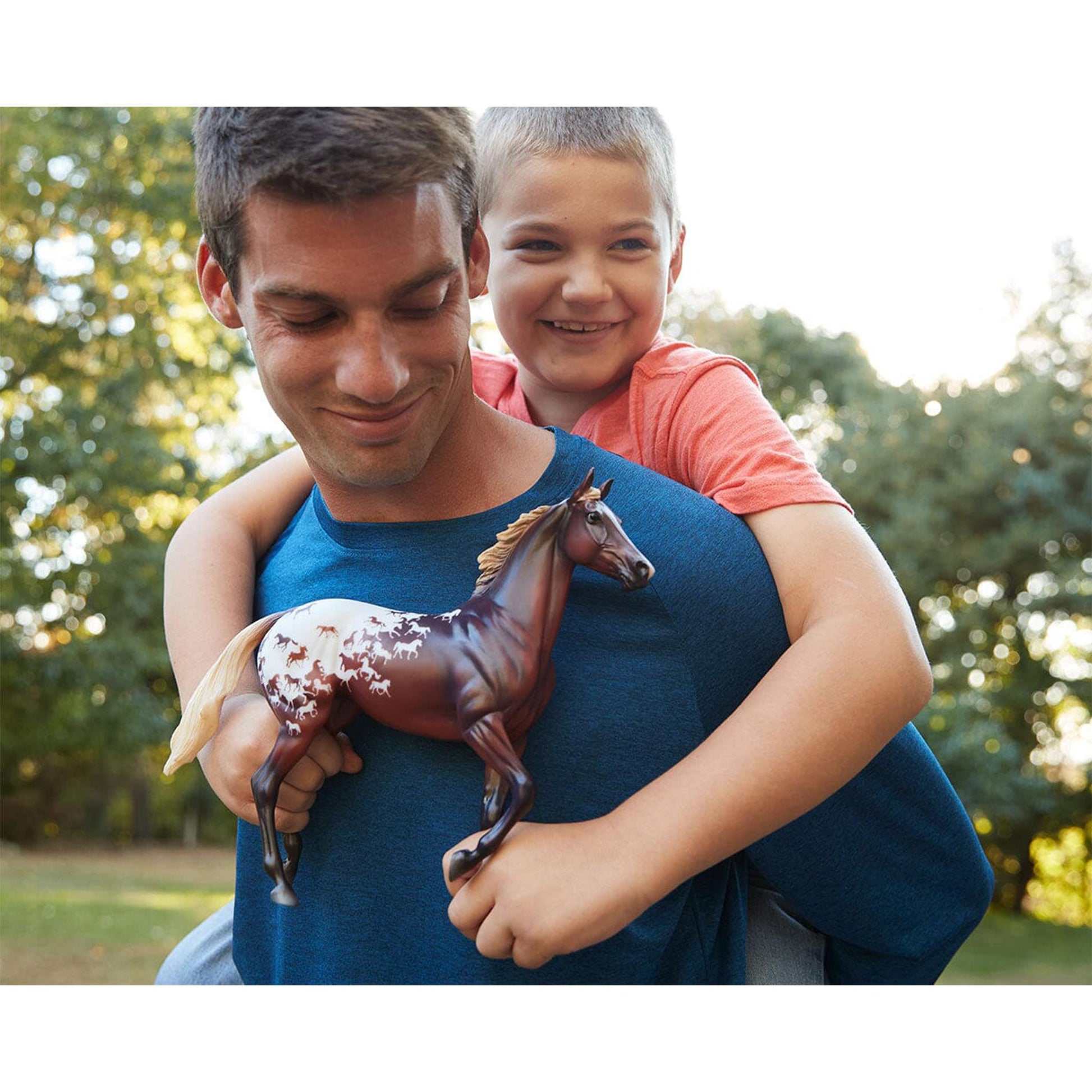 A flaxen red chestnut blanket appaloosa pattern spices up this athletic sport horse sculpted by a long-time Breyer equine artist admired for her detailed work. How many different Breyer horses can you “spot” in his coat?