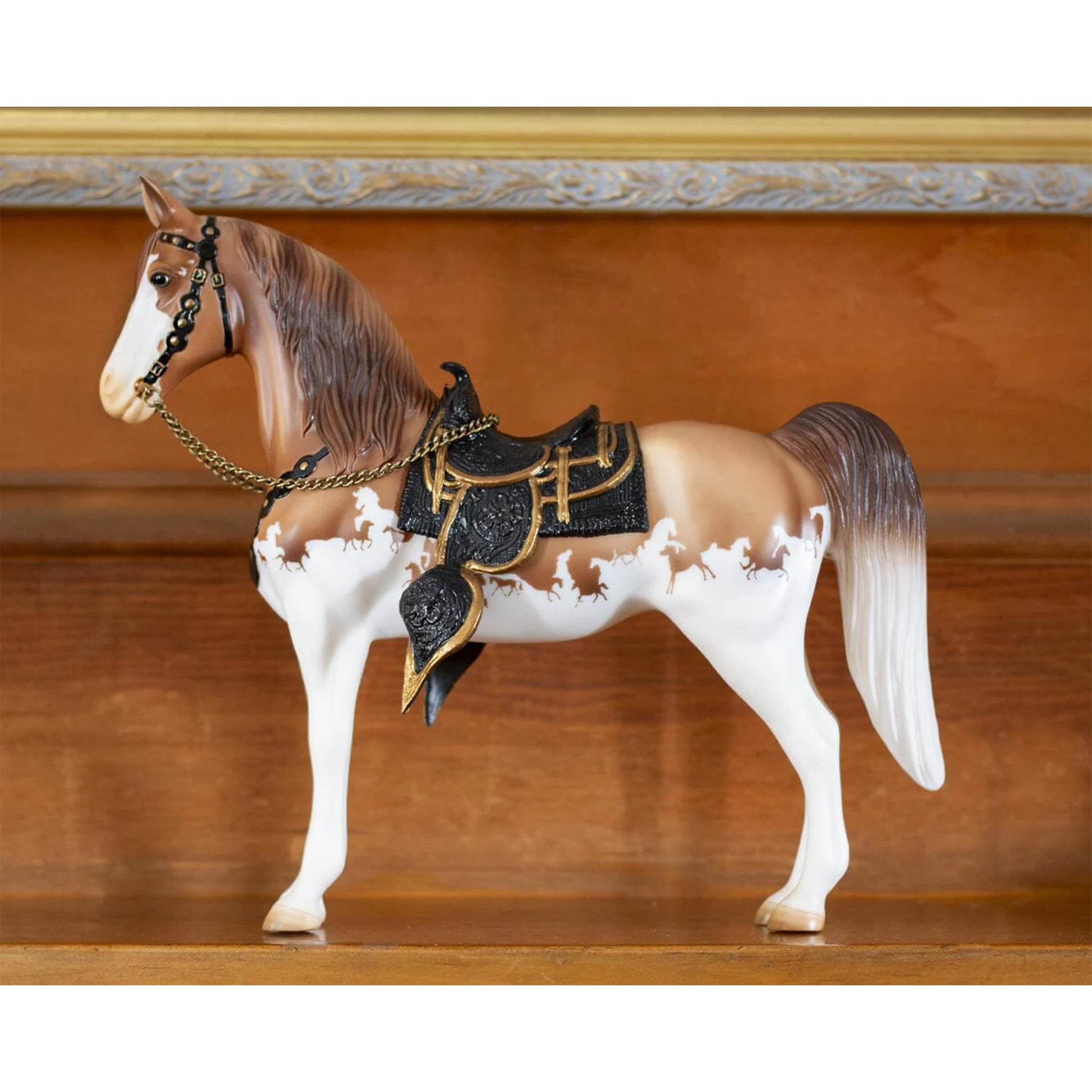 The horse that started it all! Sculpted by artist Chris Hess to originally adorn a mantelpiece clock, this iconic model has never looked better. He leads our 75th anniversary collection with a splashy red dun pinto coat, complete with his saddle, bridle, and breast collar accented in gold. Look closer and you'll find dozens of tiny Breyer horses hidden in his pattern!