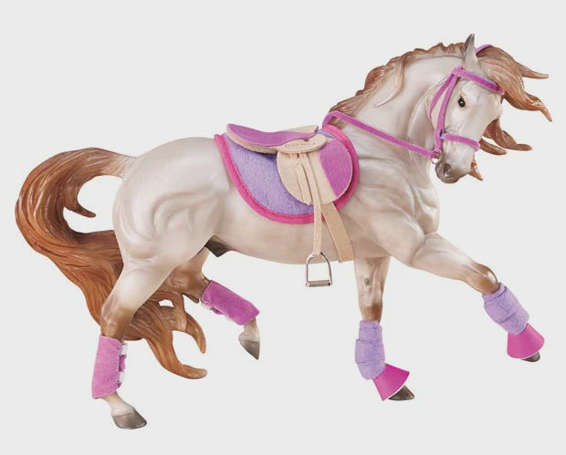 Fun colors make this set stand out! Saddle, bridle, saddle pad, polo wraps, bell boots and splint boots come in the beautiful combination of pink and purple. Blister Card Size: 9.25"L x 11"H