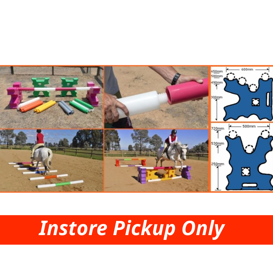 For anyone learning the finer points of jumping, brightly coloured cavaletti poles and ends are an absolute necessity. Twenty different jumps may be made – including uprights, spreads and parallels. The ends may be part-filled with water or sand for increased stability, while keeping the centre of mass low. the poles are readily pushed off the shallow positioning cups formed in the ends, however should sufficient vertical load be applied to the pole by the horse, the pole is designed to breakaway at one of the junctions of a pole component body and its formed screw end – seen in the top centre image below – so, if a mishap occurs, particularly when using the higher keyhole jump stands, no injury should be caused to horse or rider. Of course, one or more of the screw-together pole components must then be replaced.