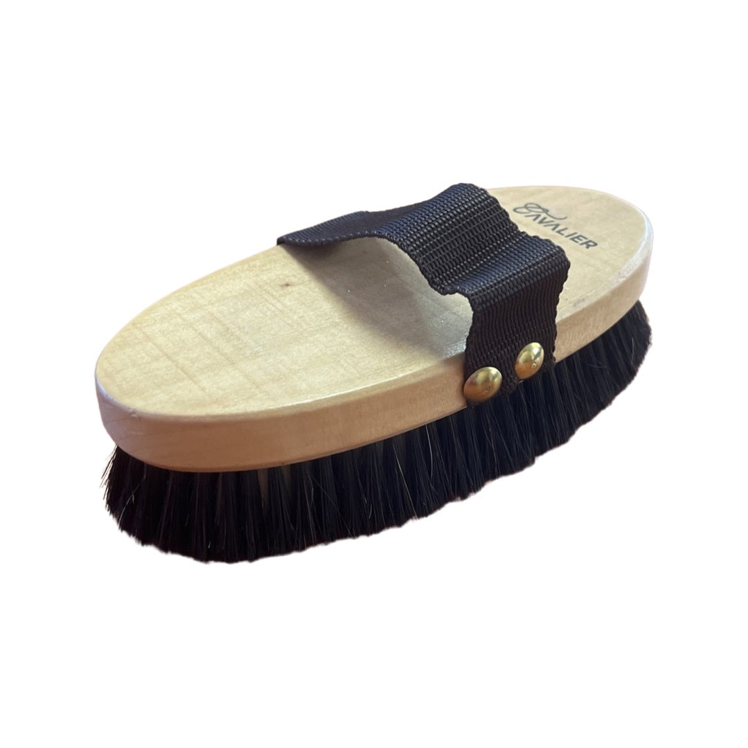 The Cavalier Natural Fibre Horse Hair Body Brush features a strap to securely hold the brush and measures 7″ x 3.5″