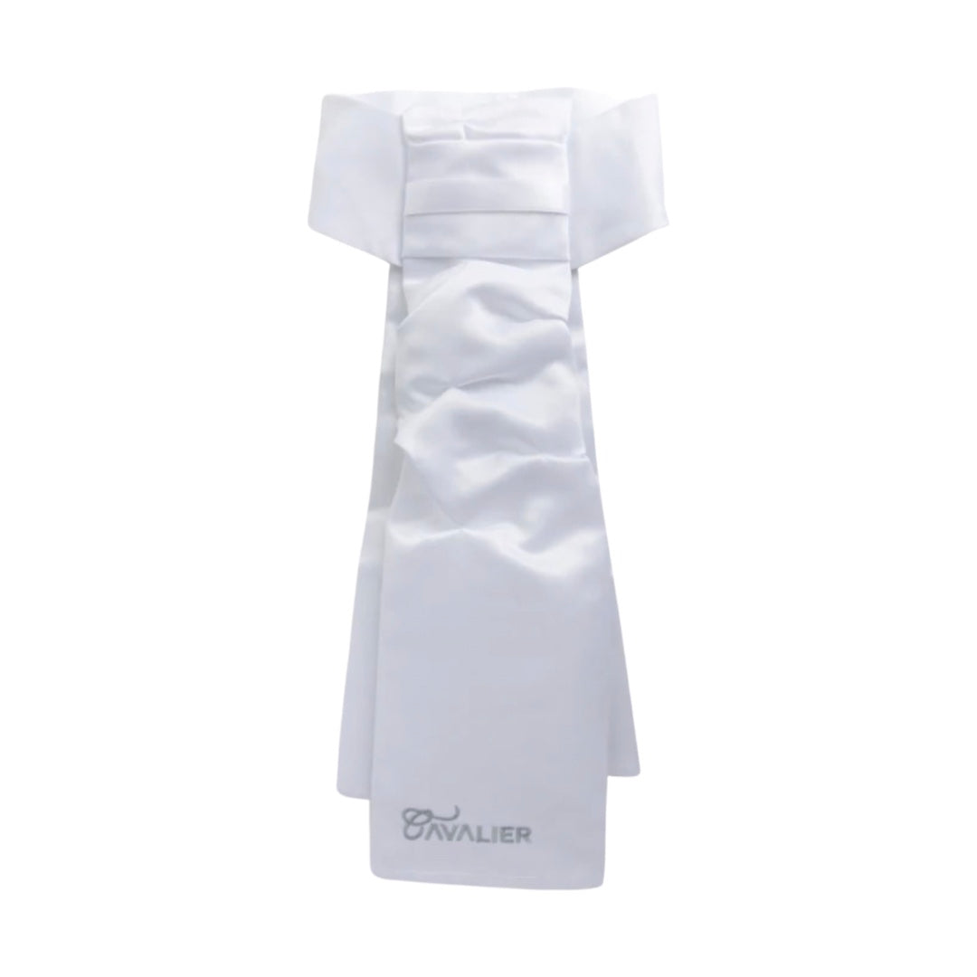 The Cavalier Pre-tied Stock is a lovely white satin stock which is a very popular item for equestrian riders for the dressage arena and show ring.