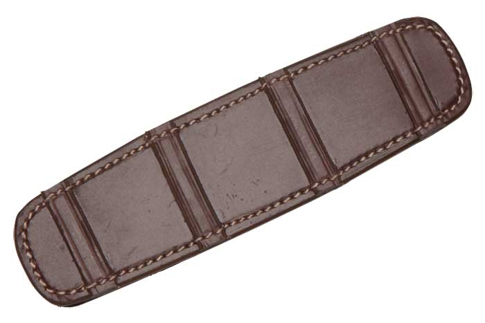 This is an open style high-quality curb chain cover. The flat leather surface lays flat against the horse's chin, while the loops hold the curb chain in place and leave them exposed for easy access to the fly link where lip straps are also used.