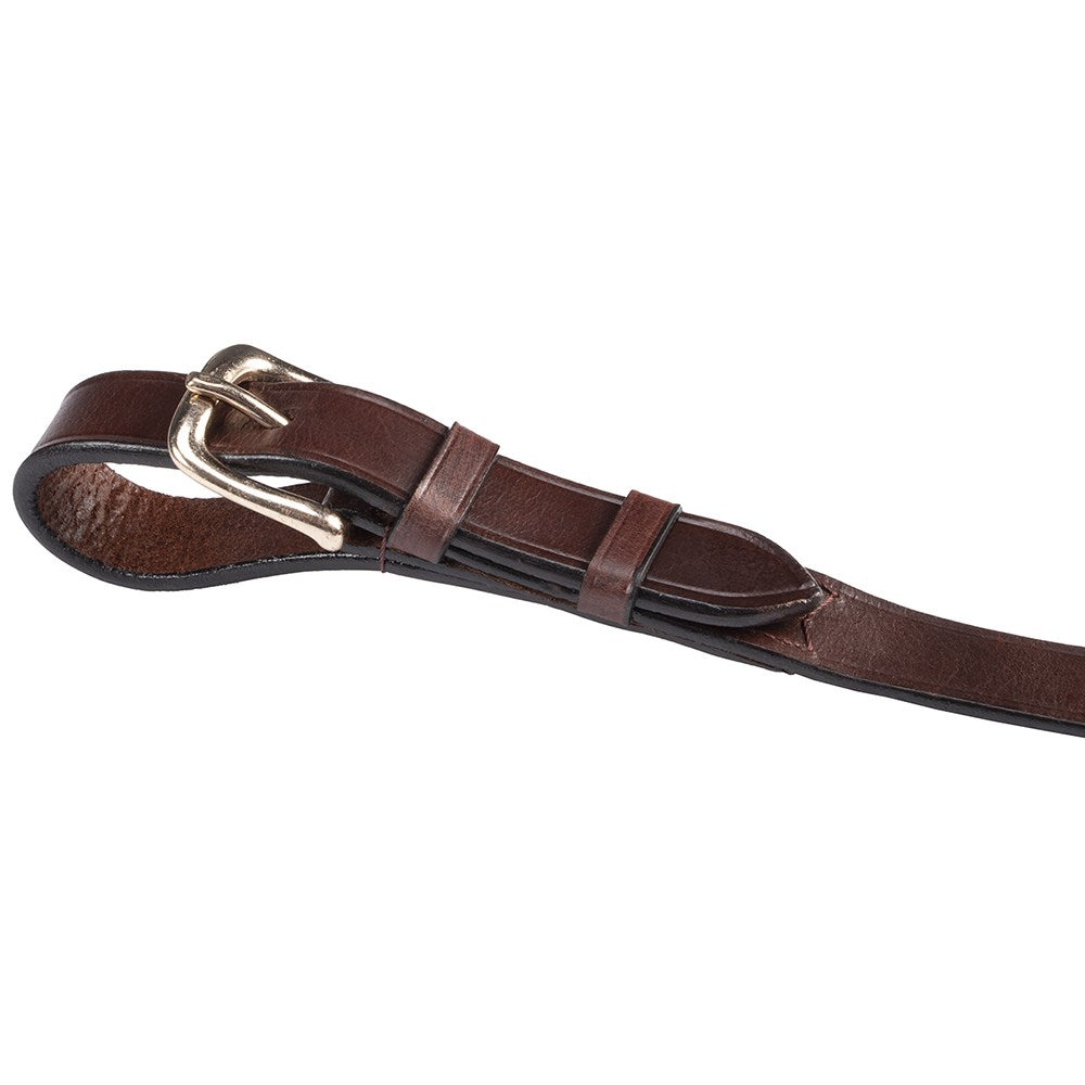 The Leather Driving Reins are a joined pair of Driving reins in hand stitched leather. They have billet ends with brass hardware.