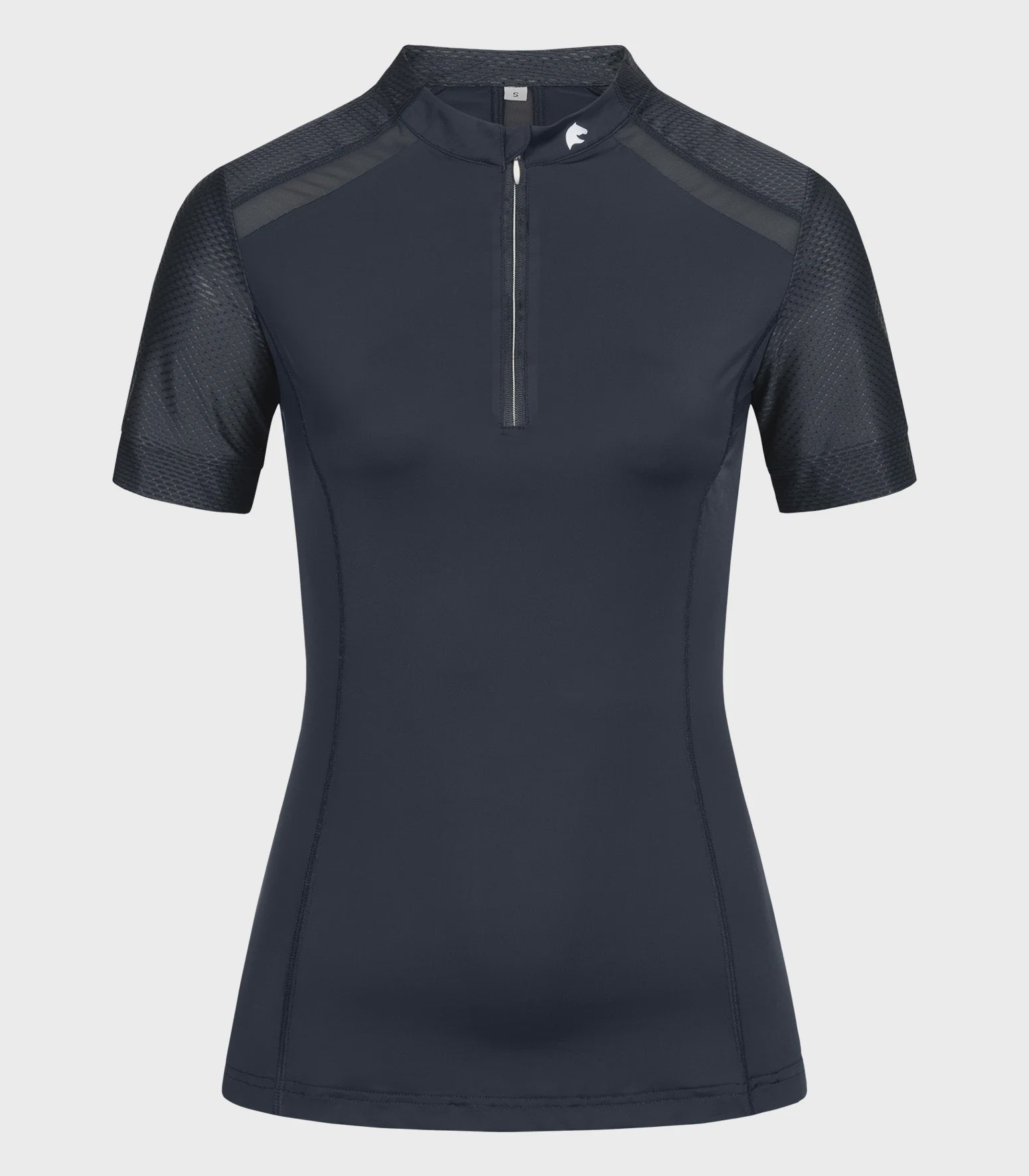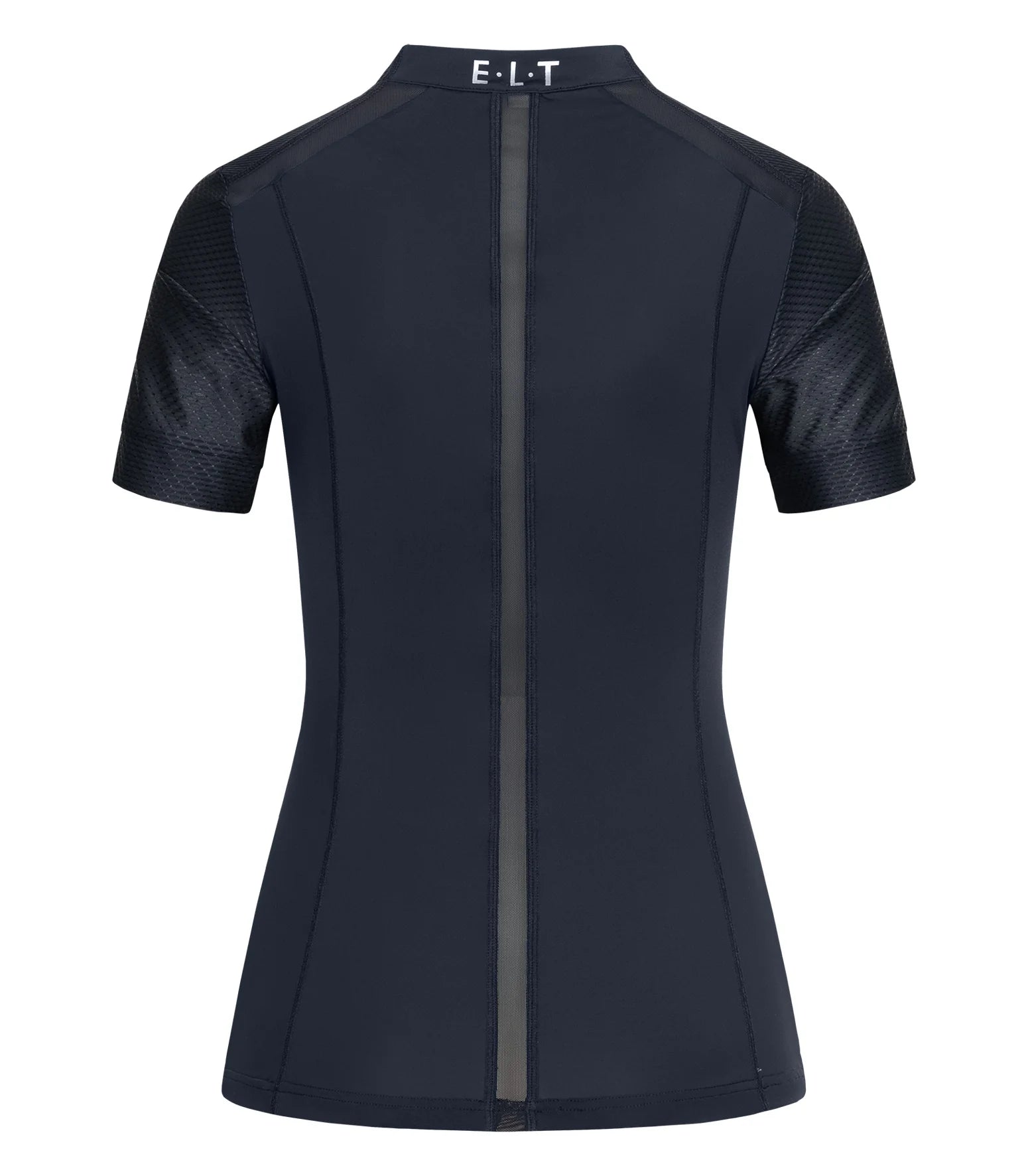 The Nancy Technical Riding Shirt is a functional short sleeve zip shirt that pairs perfectly with your favourite ELT Breeches. The sleeves and shoulders are made from a lightweight honeycomb textured weave that is breathable and allows for maximum movement during riding. The shoulder and back panels feature modest laser cutaways that are filled with a fine mesh for maximum breathability.