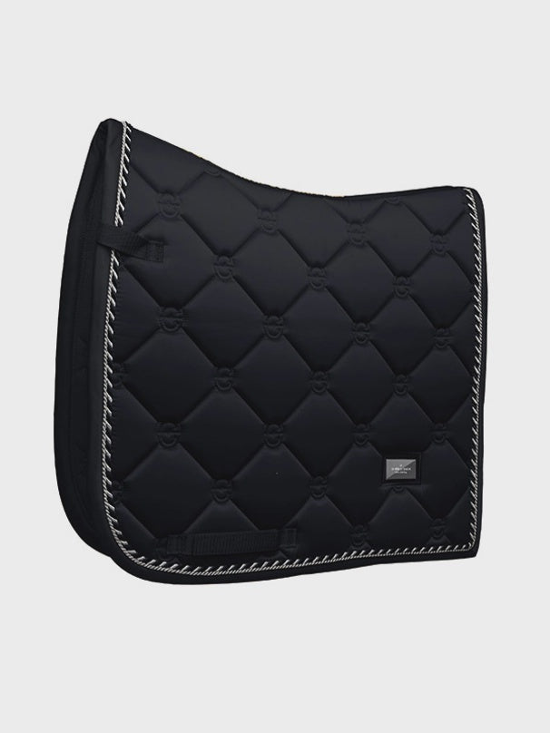 The ultimate timeless saddle pad! Our luxury saddle pad in a shiny black color is perfect for competitions or for a day of training. The material of the saddle pad is shiny and dirt resistant with beautiful details in silver and pattern in the Equestrian Stockholm logo. Style with other products from the same collection.