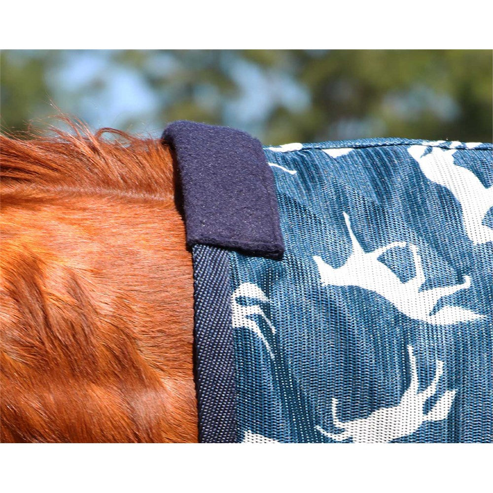 Introducing the Horsemaster Fly Mesh Combo Rug in a striking dark blue and white horse print, designed to provide exceptional protection against insects while ensuring your horse stays cool and comfortable. This lightweight rug features a durable mesh construction that promotes breathability, making it perfect for warm weather.