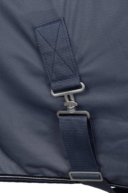 The Horze Dorchester rug is made from mesh material that brings comfort on summer days. Double t-buckles, X-surcingles, and tail strap keep it in place. Diagonal logo tape adds a sporty vibe to this rug, with double piping for a touch of elegance.