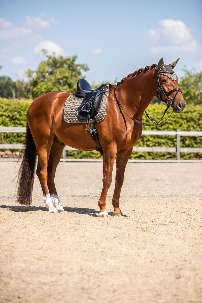 Our Horze Sandnes saddle pad is shimmery on the outside, and brushed on the inside. Pretty quilting provides padding underneath the saddle. Two straps make it easy to attach. Contrasting piping brings a touch of elegance. Also available as all purpose version. Combine it with our Horze Sandnes tendon boots and ear net for a full look!