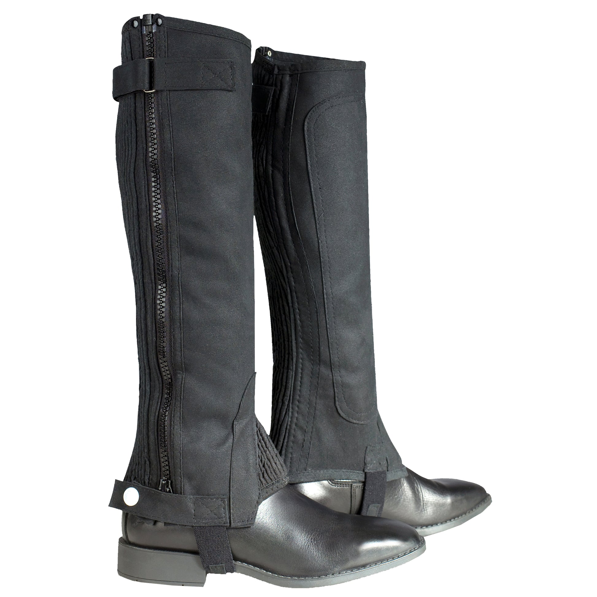 The Amara Synthetic suede chapettes with elastic sides and a velcro strap at the top of the chaps.