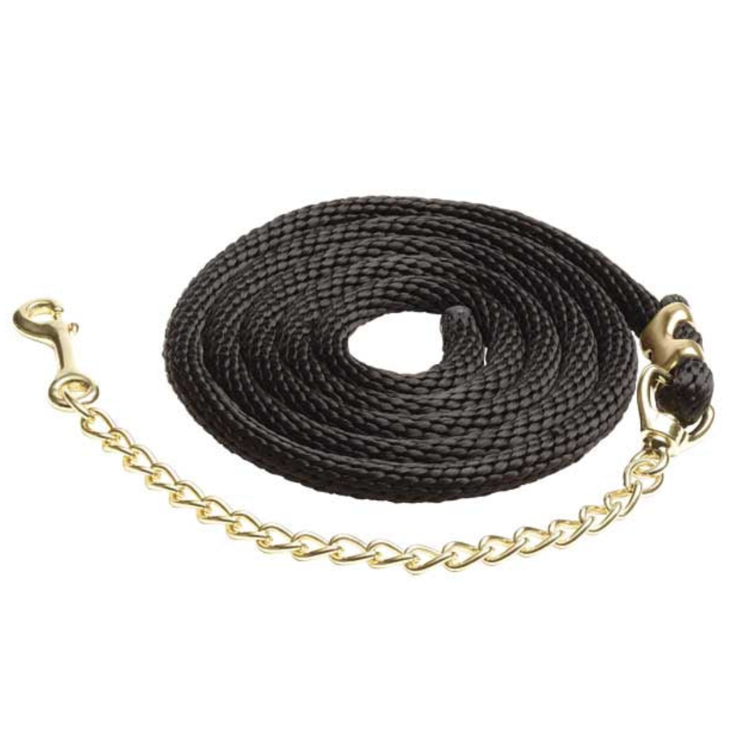 Soft braided nylon with 24" (60cm) brass plated chain. Popular for use with anti-rearing bits and lead-in bridles.
