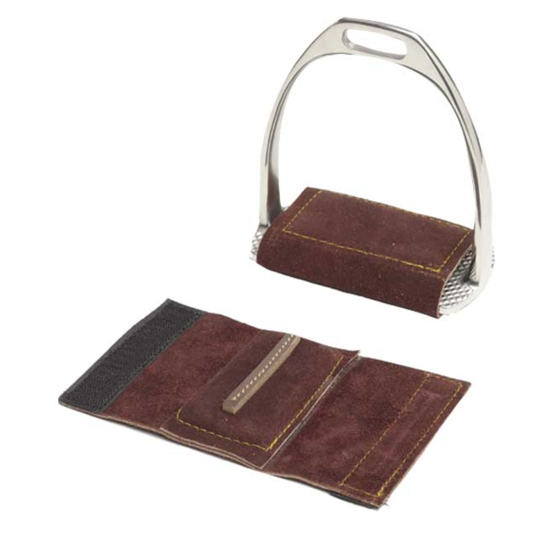 Made from dark brown suede with touch tape closure. These stirrup covers are designed to wrap around the tread of 4 bar irons. They are padded to offer shock absorption and additional comfort under the ball of the foot, as well as helping to give better grip.