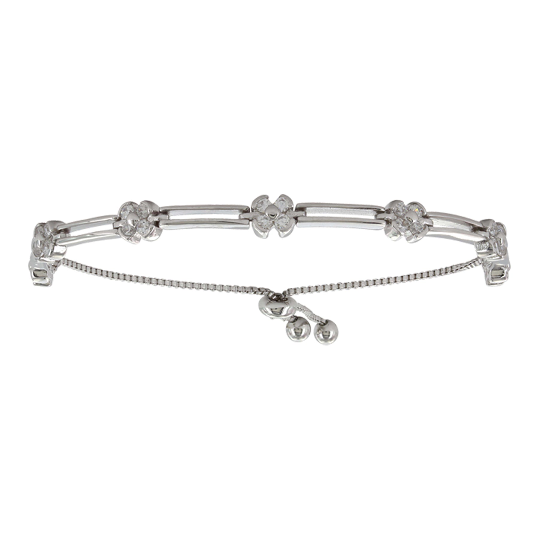 Delicate and dainty this bracelet has two thin silver toned bars that run to a cluster of four bright clear stones, this design alternates with for a total of seven times. This link bracelet fastens with a bolo style clasp.
