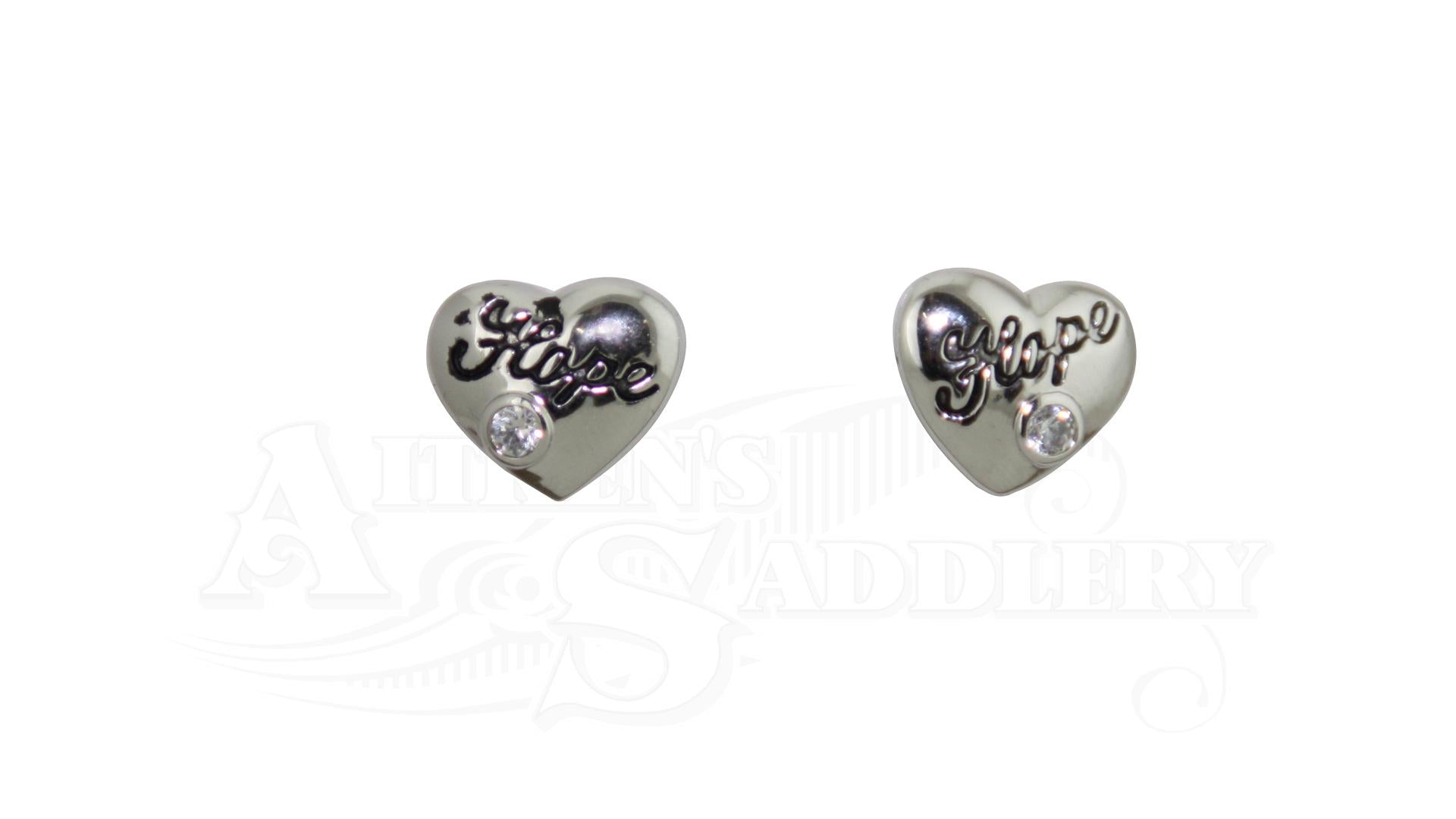 The Montana Heart shape silver ear rings are a solid heart shape with hope enscribed on the front of the heart along with a single diamonte.