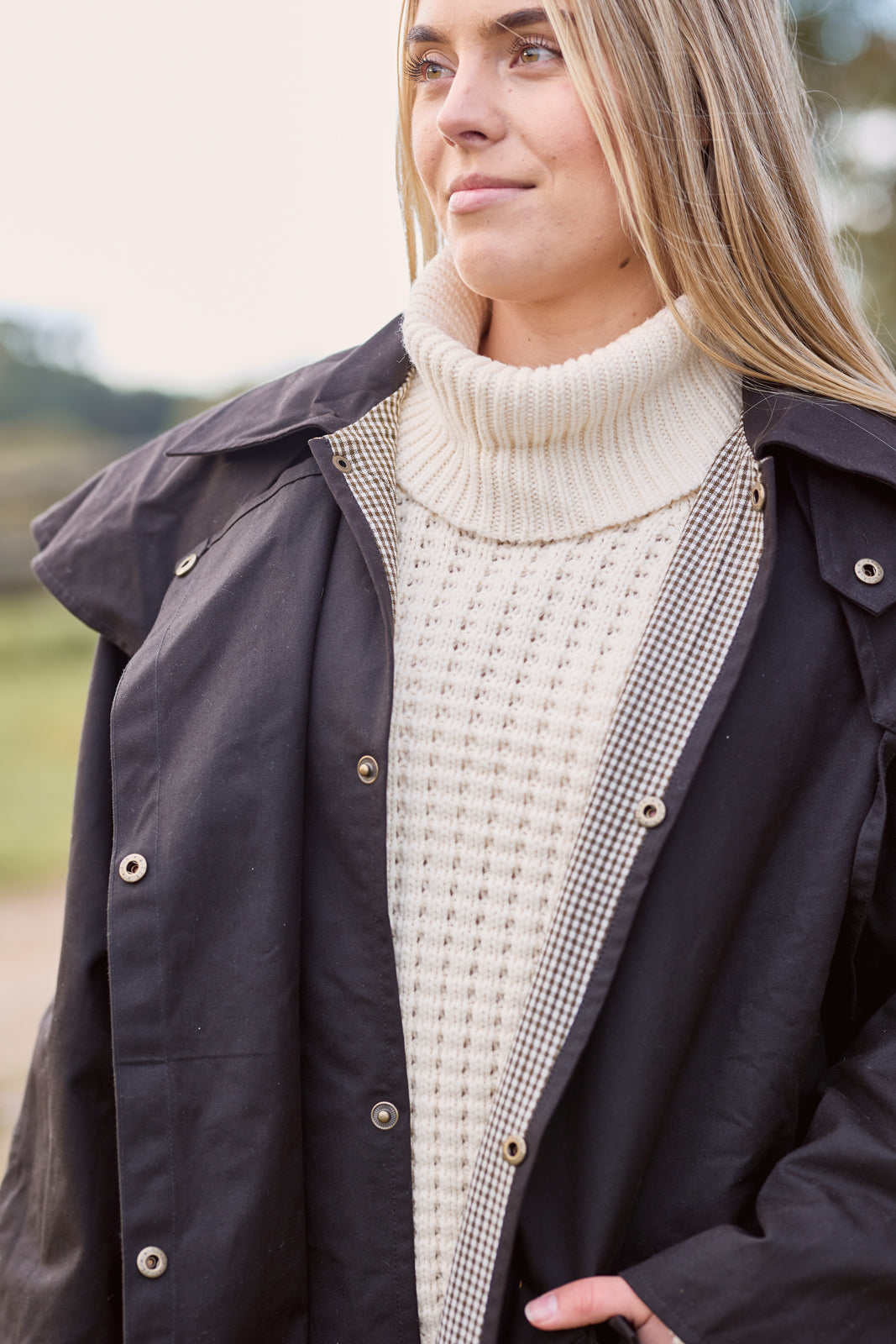 The Nullarbor Full Length Oilskin Coat is a quality, genuine brown oilskin coat providing full coverage in the coldest of winters.