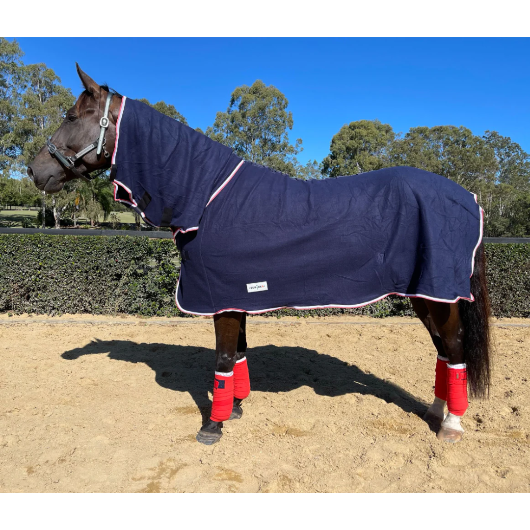 250gsm warm solid colour polar fleece material makes a breathable quality blanket that is fully polypropylene bound, BARTACK reinforced stitching to all pressure points, removable elastic leg straps, nickel plated chest buckles and combo neck has a satin strip to protect mane and 3 Velcro fittings.