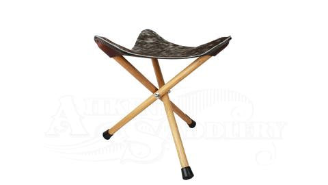 A collaspable stool made from a Leather seat and wooden tripod legs.