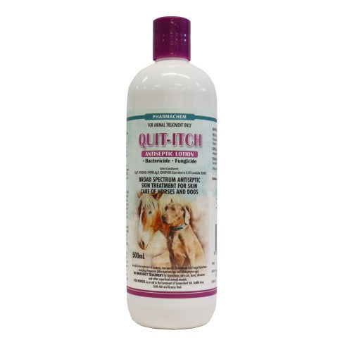 Quit-Itch Lotion is a broad spectrum antiseptic skin treatment for skin care of dogs cats and horses. For many years Quit-Itch Lotion has been a respected product in the market place for the treatment of various skin conditions such as: