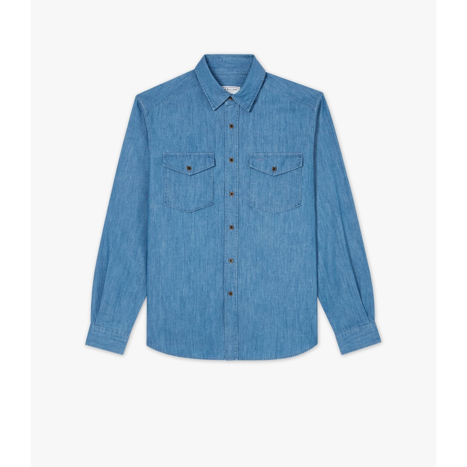Classic point collar double pocket shirt. Signature stitched pocket header with Longhorn embroidery, two tucks for added movement through the shoulder. Adjustable cuff. Branded buttons. Fabricated in a bleach wash denim