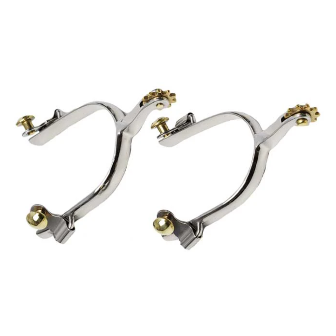 These stainless steel spurs are popular for use in western riding disciplines and come with brass rowels and buttons.