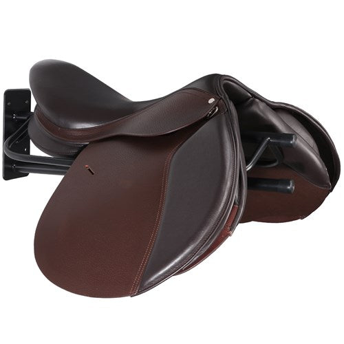 Elevate your tack room organization with our Dual-Bar Saddle Rack featuring an integrated pad hanger. Crafted from durable powder-coated tubular steel, this versatile rack accommodates both heavy Western and English saddles. The 60cm long top bar securely holds your saddle, while the lower bar, positioned 6cm below, provides ample space for airing and drying saddle pads. At 29cm wide, this compact design maximizes space efficiency in stables or tack rooms. The sturdy wall-mounting plate ensures stability and easy installation. Experience the convenience of organized, accessible tack storage. Upgrade your equestrian setup today and enjoy the benefits of a clutter-free space.