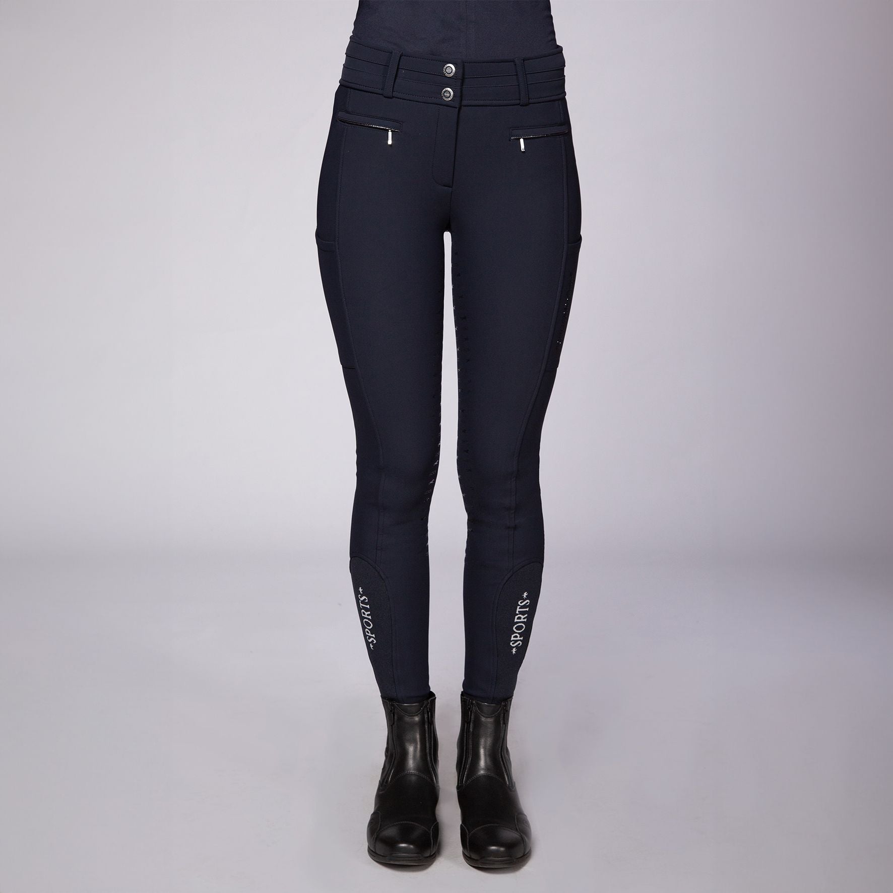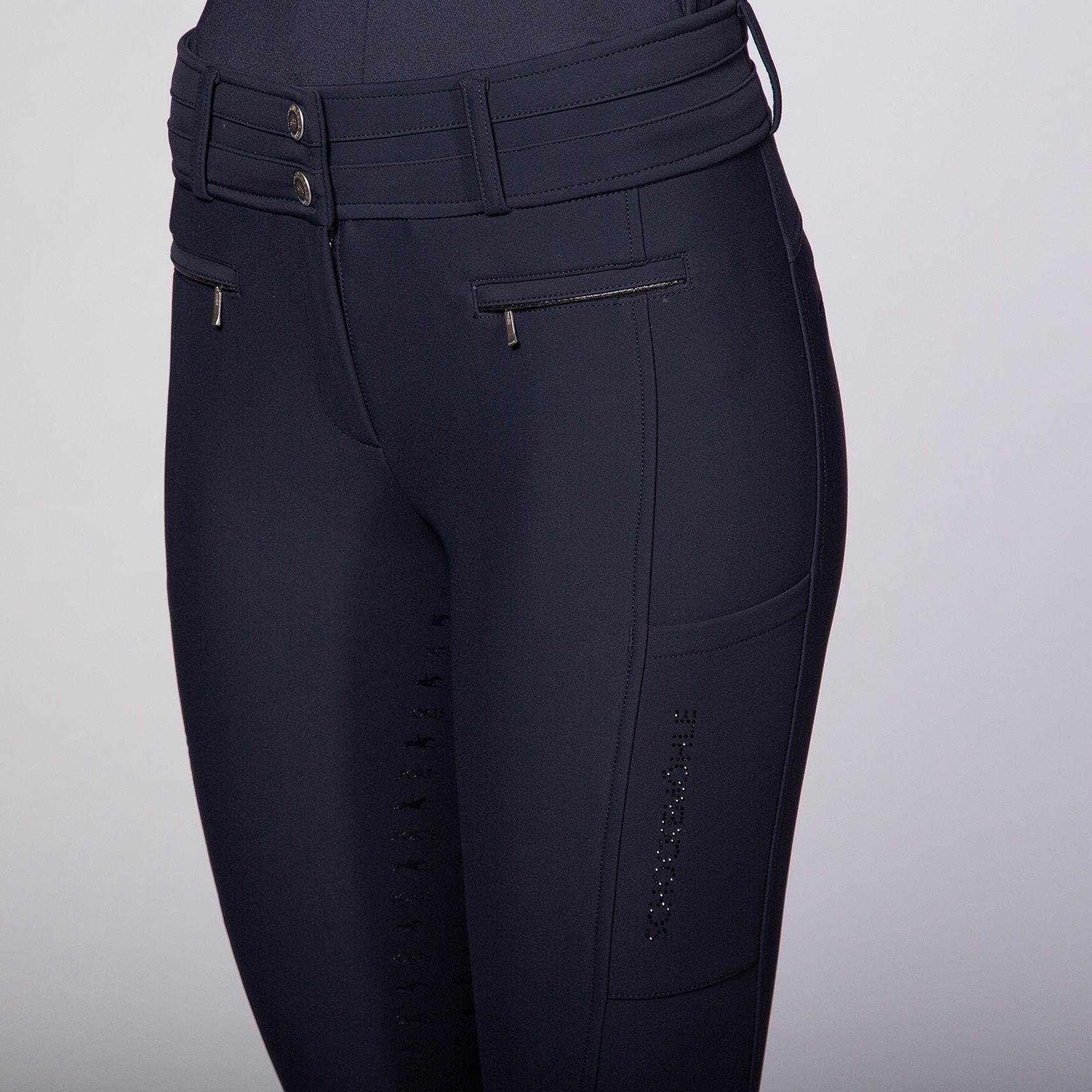 Never freeze again! With the Heather FS Style winter breeches from Schockemöhle Sports not only the limbs but also the kidneys stay nice and warm thanks to their high waistband. With their full seat silicone print, the Heather FS Style winter breeches ensure the best possible hold in the saddle and have practical welt pockets with zippers in the front as well as cell phone pockets on both sides. These breeches are also particularly comfortable to wear thanks to the elastic cuffs with logo jacquard at the hem. Fashionable details are not neglected either: the Winter Heather FS Style has a glitter piping on the last as well as a logo rhinestone motif on the left side.