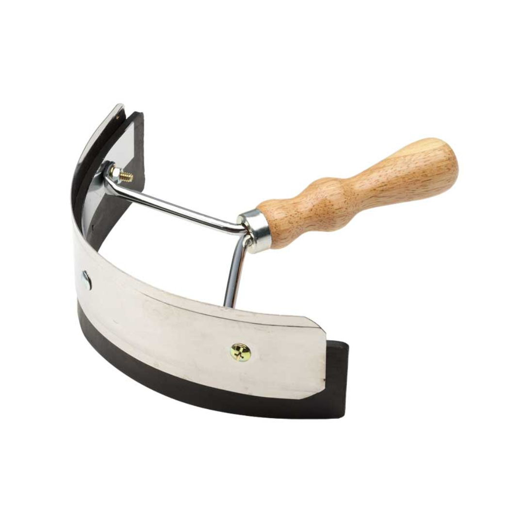 Stainless steel construction with a wooden handle and rubber blade. Used for effective removal of sweat and water.