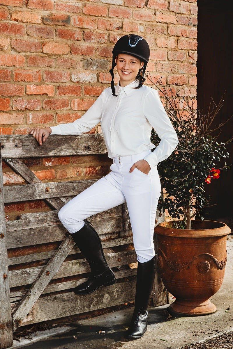 These high rise jodhpur tight has a full gel dot seat, belt loops and a handy phone pocket.