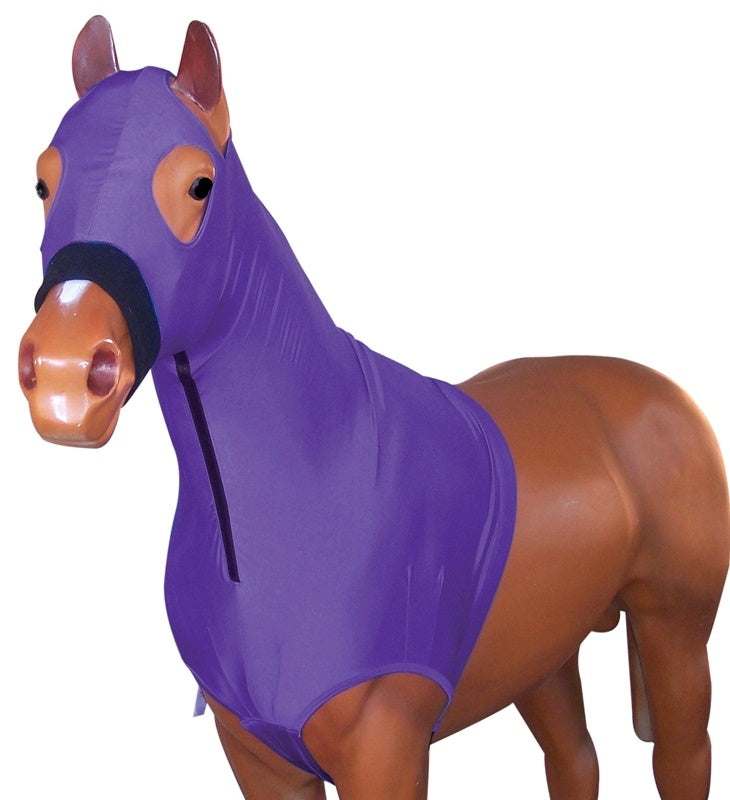 The Lycra skinny hood/vest secures over the wither and under the girth for the ultimate protection. The zipper makes for easy dressing and a firm fit.