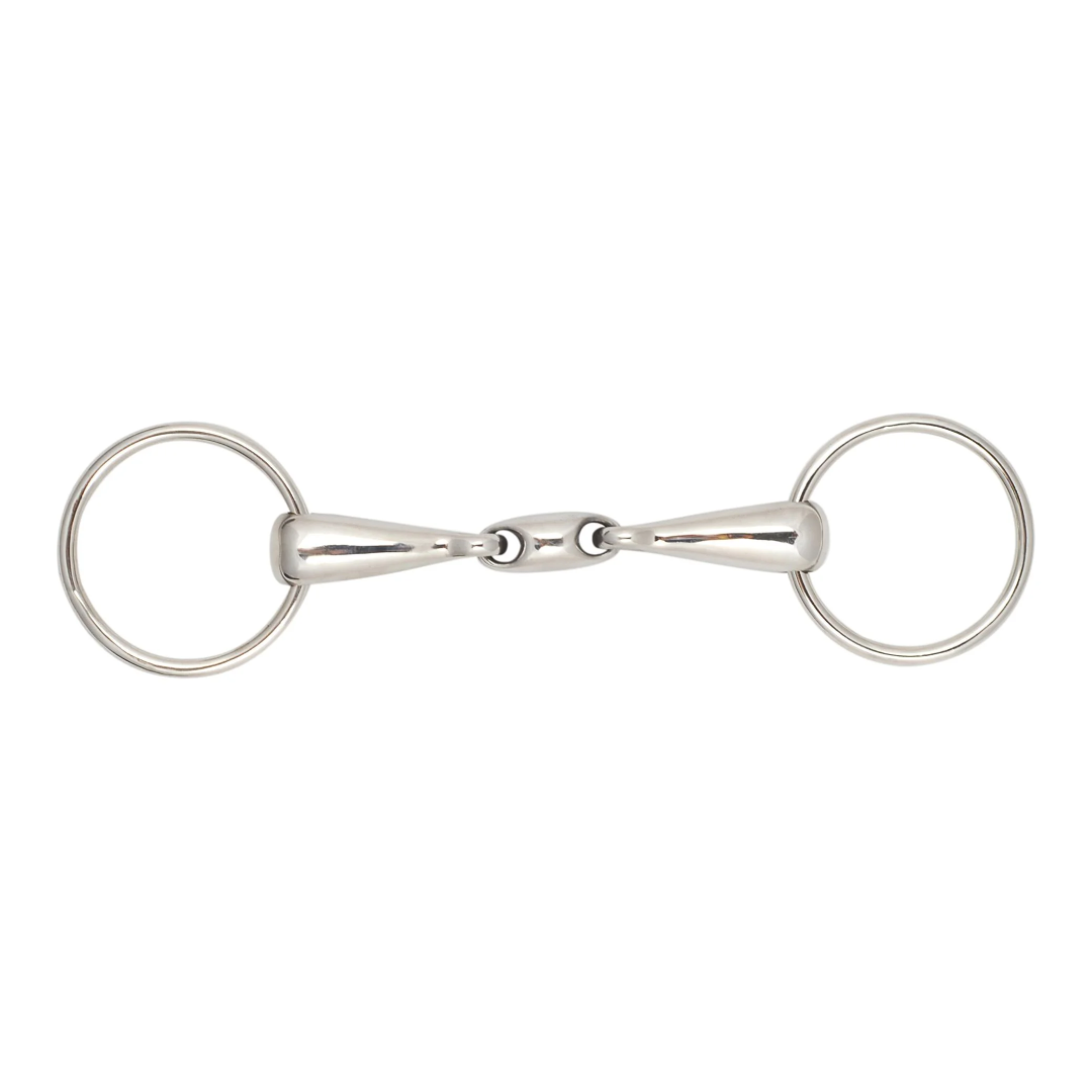 This is a Stainless Steel Double Jointed Bit. The Double Joint helps eliminate the nutcracker action in the horse's mouth.
