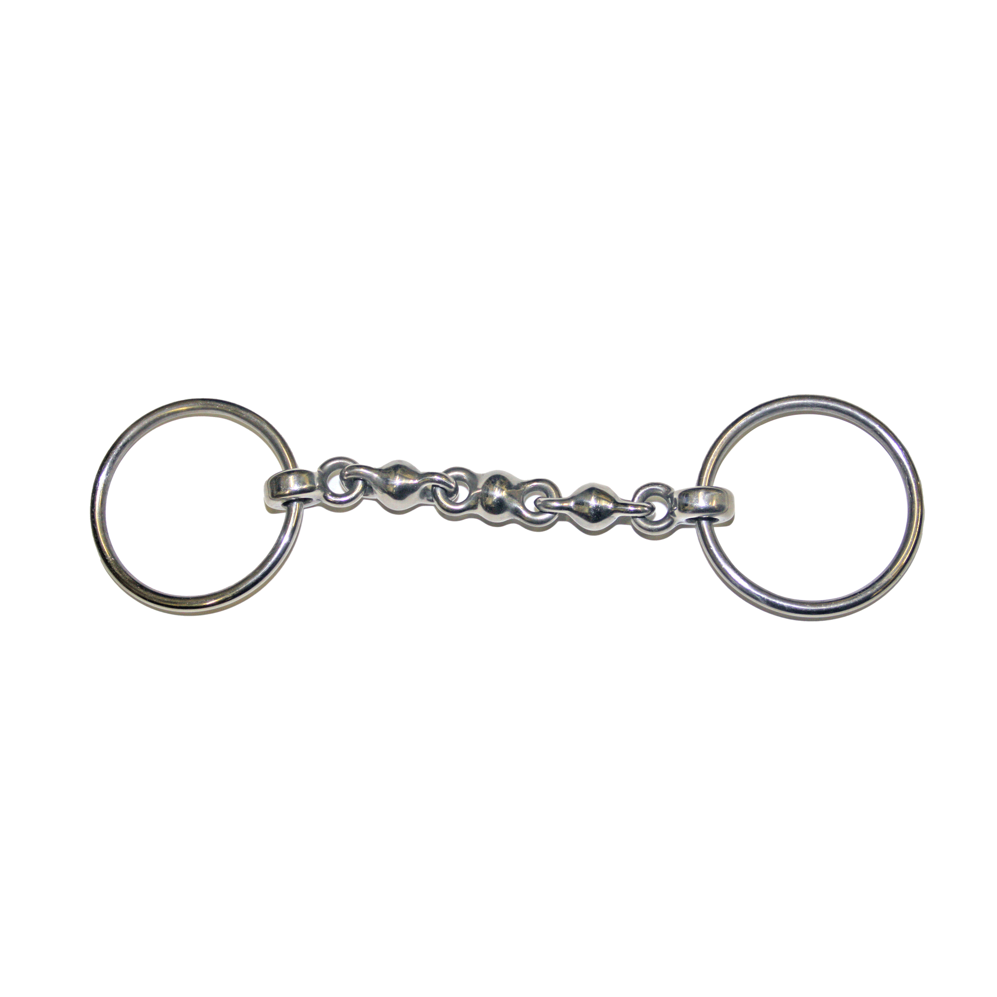 A loose ring bit with a waterford snaffle mouthpiece. The loose rings allows the bit to find its own position in the horses mouth.
