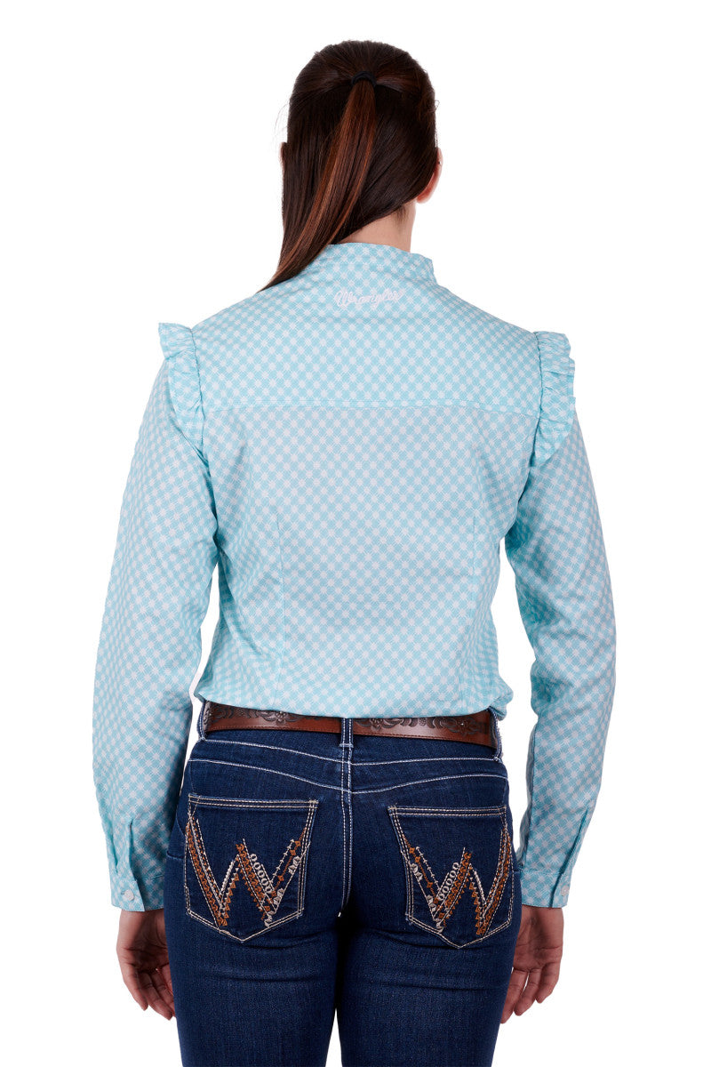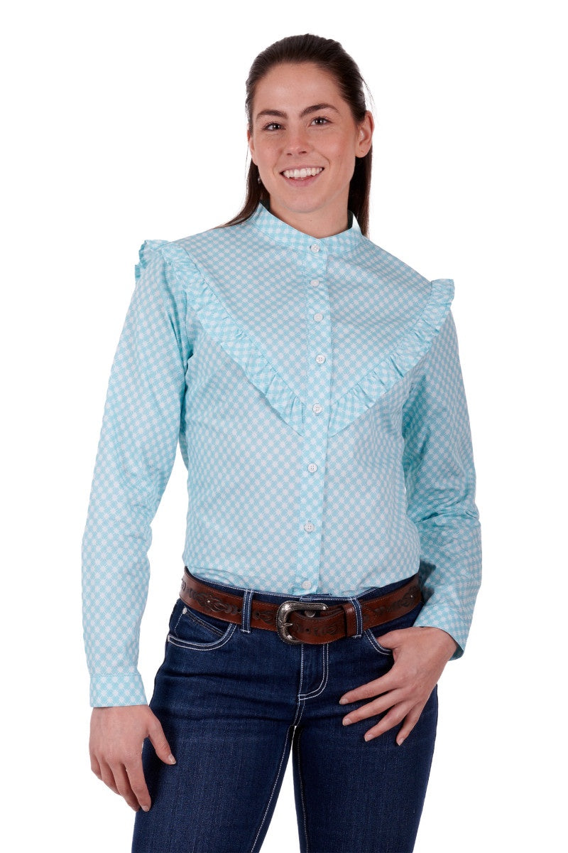 - Classic button down long sleeve shirt with ruffle detail on front yoke and armholes